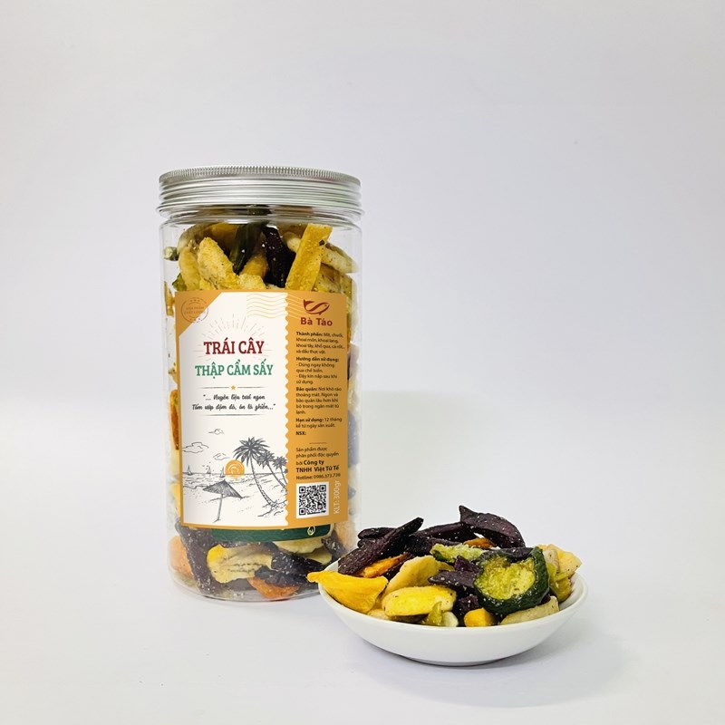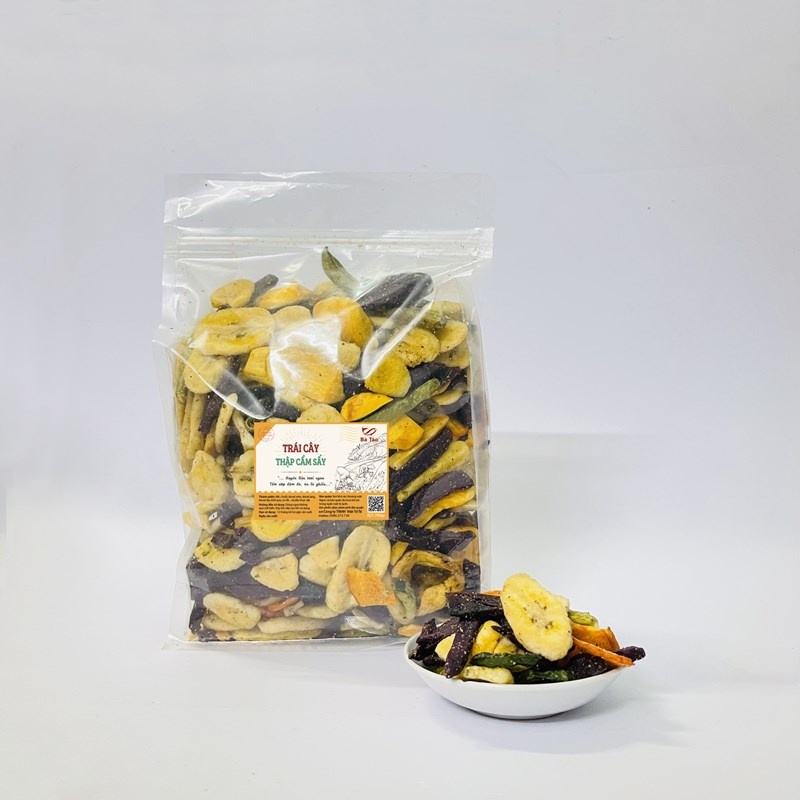 Trái cây sấy giòn đặc biệt Được chế biến từ các loại Rau, Củ, Quả xanh ngon như: chuối, khoai lang, khoai môn, mít….. Món trái cây thập cẩm sấy khô không còn quá lạ với người tiêu dùng và chúng dần trở thành món ăn không thể thiếu trong ngày tết bởi sự tiện lợi, sự phù hợp với mọi lứa tuổi cũng như sự hấp dẫn mà chúng mang lại.