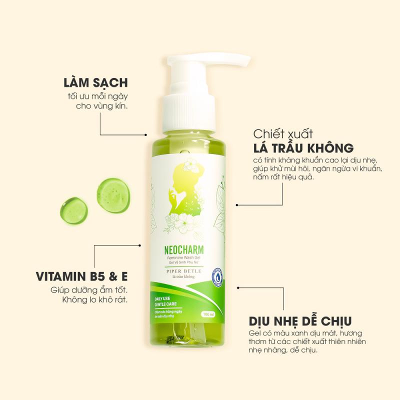 Gel vệ sinh phụ nữ NEOCHARM – dạng gel chiết xuất chính từ lá trầu không, vừa lành tính và dễ dàng sử dụng. Nguyên liệu có nguồn gốc thiên nhiên, thân thiện và tối ưu công dụng. Sự kết hợp giữa các thành phần truyền thống như lá trầu không, lá sen, tinh dầu tràm,… và thành phần xu hướng mới từ rong biển nâu, gel vệ sinh phụ nữ NEOCHARM giúp ngăn ngừa các bệnh viêm nhiễm phụ khoa tối ưu, mang lại sự sạch sẽ, thơm mát, tự tin. Đặc biệt với Vitamin B5 và Vitamin E có trong thành phần giúp dưỡng ẩm, bảo vệ toàn diện cho sức khỏe vùng kín.
