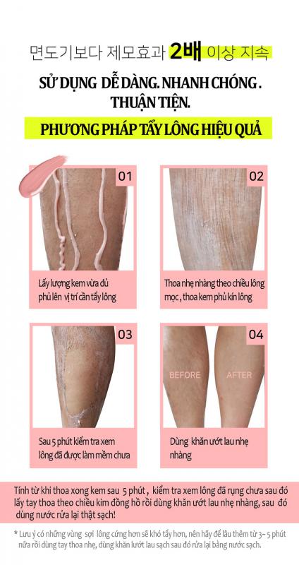 * Lưu ý: Có những sợi lông cứng hơn sẽ khó tẩy hơn , nên hãy để lâu thêm từ 3~ 5 phút nữa rồi dùng tay thoa nhẹ,dùng khăn ướt lau nhẹ nhàng sau đó rửa lại bằng nước sạch.