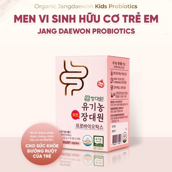 Men vi sinh hữu cơ trẻ em Jang Daewon Probiotics là men vi sinh hữu cơ giúp hỗ trợ bổ sung lợi khuẩn cho cơ thê, hỗ trợ tốt cho hệ tiêu hóa. Sản phẩm thích hợp sử dụng cho bé từ 6 tháng tới 12 tháng tuổi biếng ăn, hấp thu kém, chậm tăng cân, rối loạn tiêu hóa.
