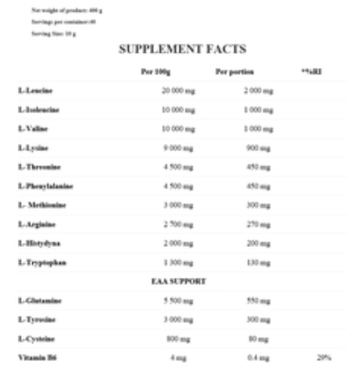 – EAA với các axit amin thiết yếu là một nhóm các hợp chất hóa học hữu cơ (axit amin) là “hình ghép” cơ bản để xây dựng các peptide và protein. Thật không may, cơ thể chúng ta không thể tự tổng hợp (sản xuất), vì vậy điều quan trọng là cung cấp cho họ một chế độ ăn uống hợp lý hoặc với sự trợ giúp của việc bổ sung. Thành phần bao gồm phức hợp BCAA, tức là ba axit amin chuỗi dài: Leucine, Valine và Isoleucine, cũng như các hợp chất như: Lysine, Threonine, Phenylalanine, Methionine, Arginine, Histidine và Tryptophan. Phức hợp OstroVit EAA, thông qua các axit amin protein, hỗ trợ quá trình tái tạo và đồng hóa của các tế bào cơ của chúng ta. Các thành phần của chất bổ sung góp phần hỗ trợ và trực tiếp tham gia vào một số quá trình sống của cơ thể, hỗ trợ hệ thống miễn dịch, thần kinh và tiêu hóa.