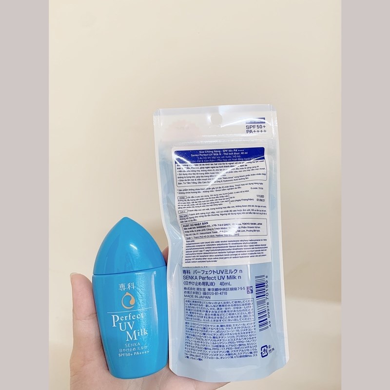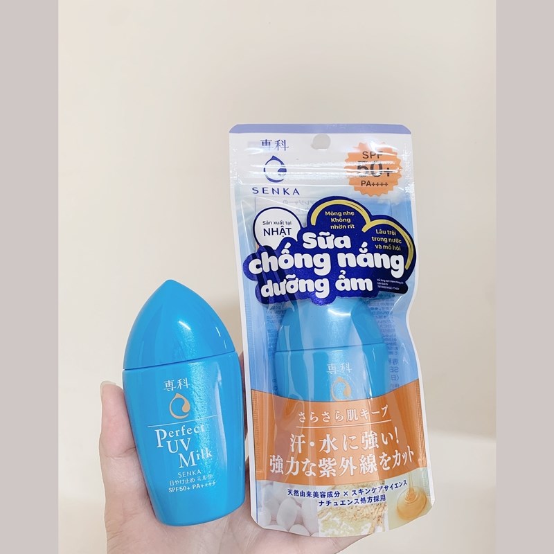 Sữa chống nắng dưỡng ẩm Senka SPF50+ PA++++ 40ml- Chỉ số chống nắng cao, hiệu quả chống nắng vượt trộiSữa chống nắng dưỡng ẩm Senka SPF50+ PA++++ 40ml không chỉ giúp bạn bảo vệ làn da khỏi tác hại của tia UV mà còn dưỡng ẩm và làm mềm da, tạo cảm giác mượt mà như lụa. Với sức mạnh của kén tơ tằm trắng của Mayu Haku, kết hợp lợi ích của thành phần “sericin” trong kén tơ tằm trắng và chất “tơ thủy phân” có nguồn gốc từ lõi của sợi tơ, sữa chống nắng Perfect UV Milk Senka giúp đảm bảo hiệu quả dưỡng ẩm hoàn thiện hơn nhiều. Sữa chống nắng dưỡng ẩm Senka SPF50+ PA++++ 40ml mang lại cảm giác mịn mượt và luôn để lại bề mặt da tươi sáng, rạng rỡ. Sử dụng sức mạnh kén tơ trắng của Mayu Haku kết hợp với việc sử dụng thành phần “Sericin” trên tơ lụa trắng và chất “tơ thủy phân” chiết xuất từ lõi của sợi tơ tằm, Perfect UV Milk Senka SPF50 / PA ++++ Perfect UV Milk Senka giúp cho hiệu quả dưỡng ẩm toàn diện trở nên trọn vẹn hơn rất nhiều.Công dụng của Sữa chống nắng dưỡng ẩm Senka SPF50+ PA++++Công dụng của Senka Sữa chống nắng dưỡng ẩm SPF50+ PA++++ 40ml gồm:Chống tia UV mạnh mẽ với SPF 50+ và PA ++++. Bảo vệ da khỏi tia UV có hại, ngăn ngừa sự hình thành các đốm nâu, sạm da. SPF 50+ chống lại tia UVB gây sạm da, cháy nắng. Chỉ số PA ++++ chống lại tia UVA, tác nhân gây ra những đốm nâu, tàn nhang và lão hóa.Không trôi trong nước và mồ hôi, thích hợp cho các hoạt động ngoài trời.