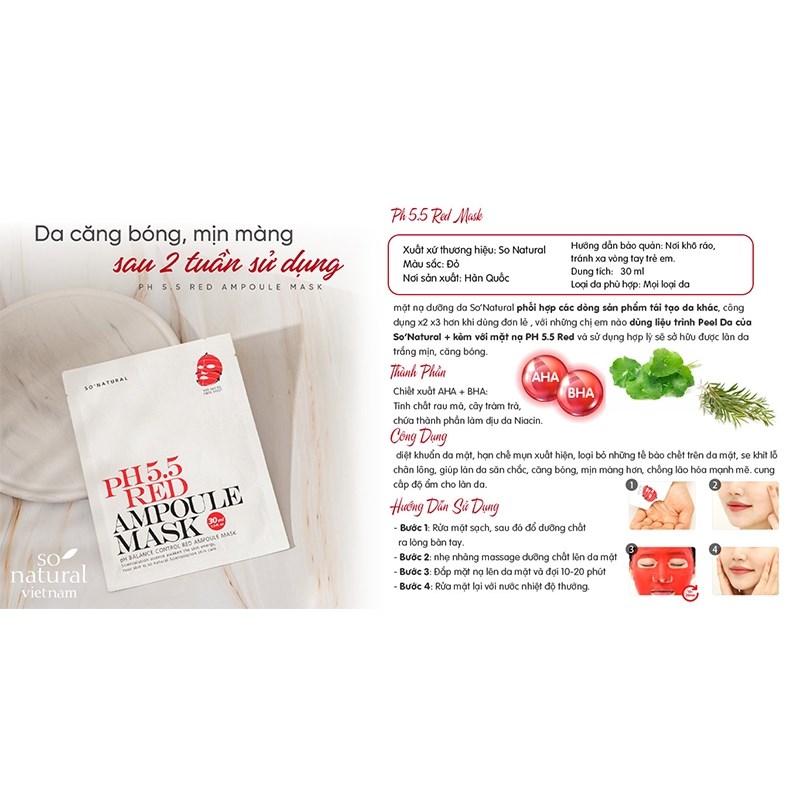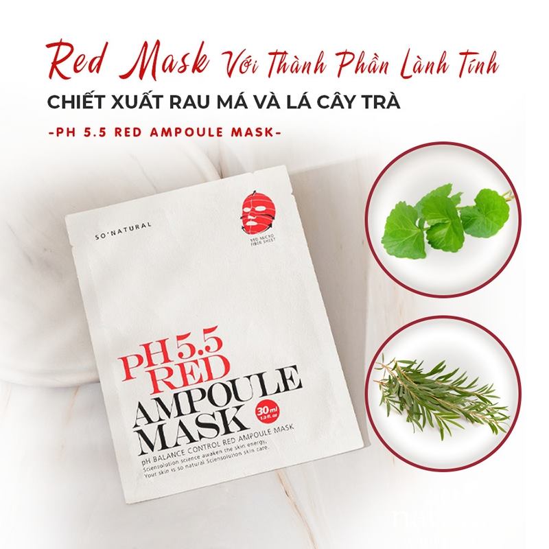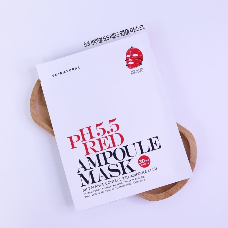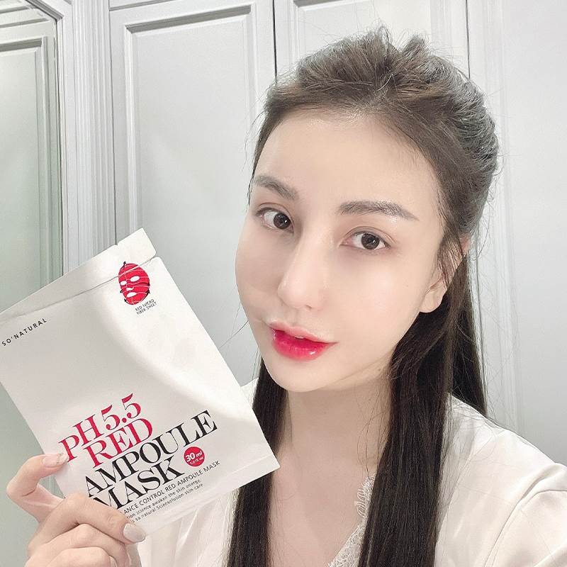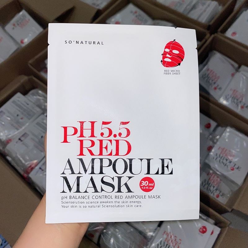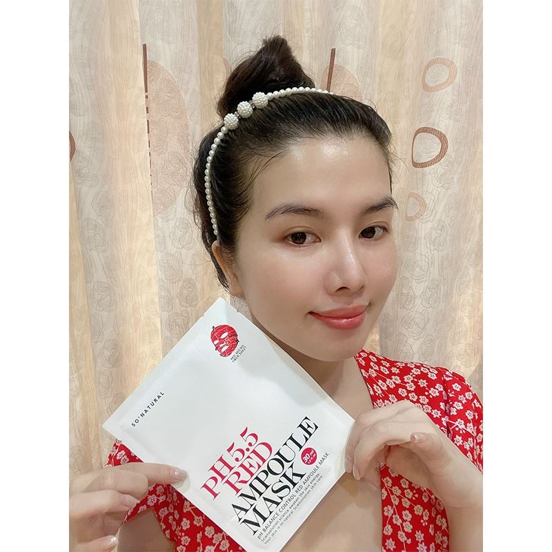 Song hành với các bước chăm sóc da thì việc đắp mặt nạ cũng là một bước quyết định góp phần vào việc cải thiện làn da. Vì vậy với chị em phụ nữ việc lựa chọn được một loại mặt nạ phù hợp với làn da của mình là hết sức quan trọng. Combo 5 chiếc mặt nạ So’Natural dưỡng ẩm cân bằng da pH 5.5 Red Ampoule Mask 25g là dòng sản phẩm phù hợp với hầu hết mọi loại da, từ da khô, da dầu, da mụn hay là da nhạy cảm, tất cả mọi đối tượng khách hàng đều có thể yên tâm sử dụng. Mặt nạ được sản xuất dựa trên các thành phần tự nhiên như tinh chất rau má và trà xanh kết hợp với AHA và BHA cùng với Niacin mang lại cho làn da cảm giác dịu nhẹ, căng bóng và thoáng mát khi sử dụng. Sản phẩm sẽ như một “ vị cứu tinh” cho chị em chúng ta trong mùa hè nắng nóng oi bức ngay khi vừa bỏ miếng mặt nạ xuống. Một cảm giác thông thoáng, sạch sẽ cùng với sự mềm mại sẽ là những điều bạn có thể dễ dàng nhận biết trong tức thì.