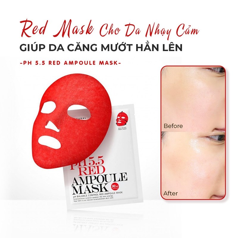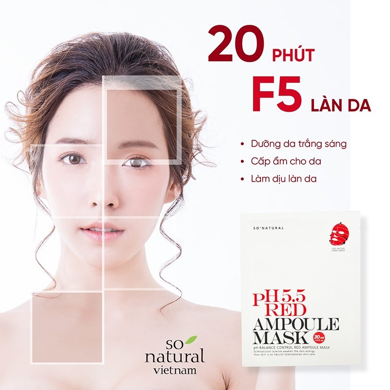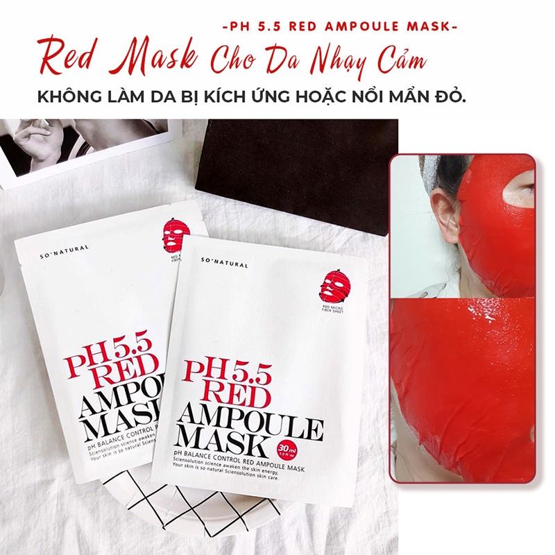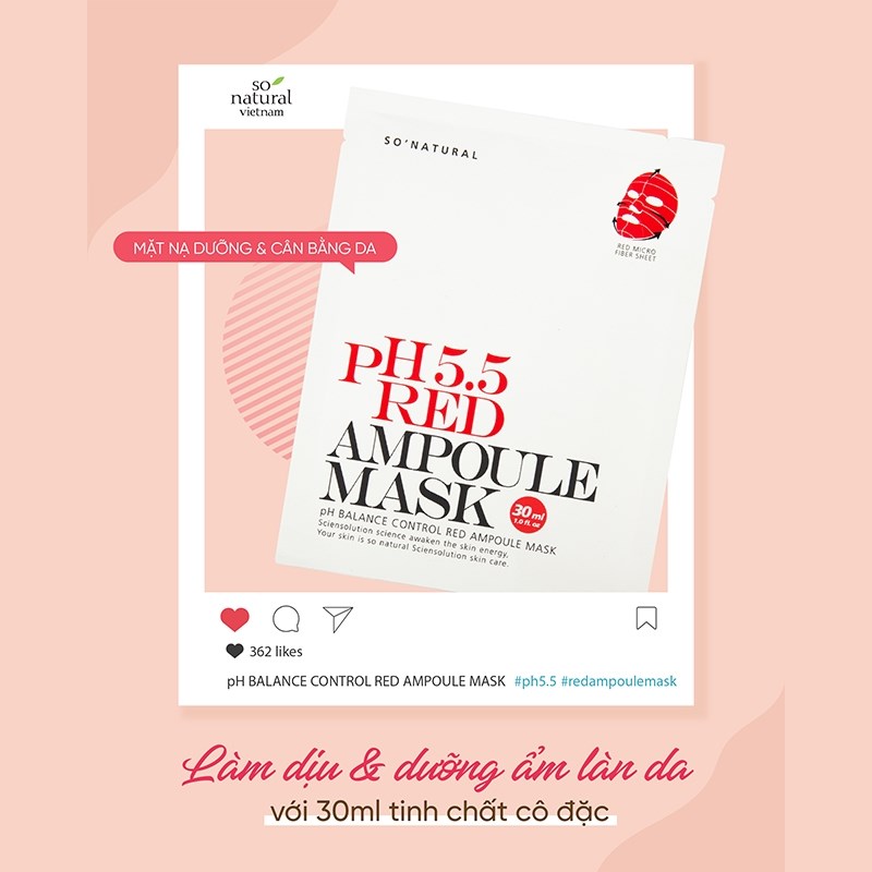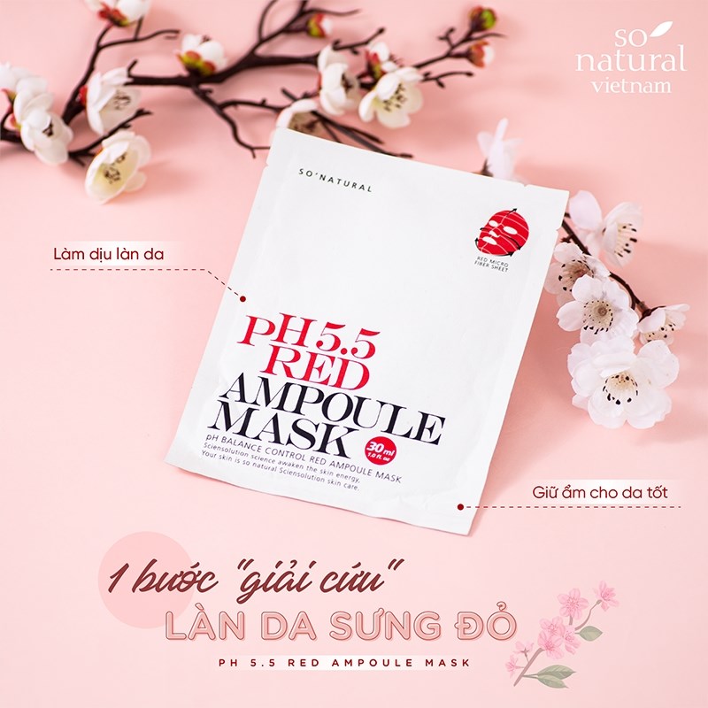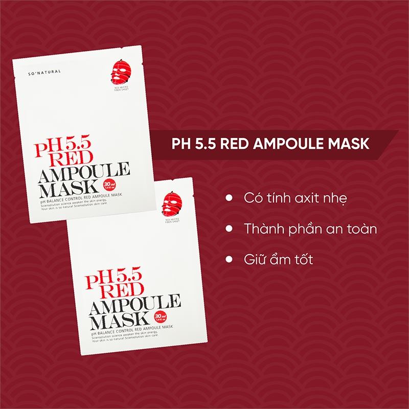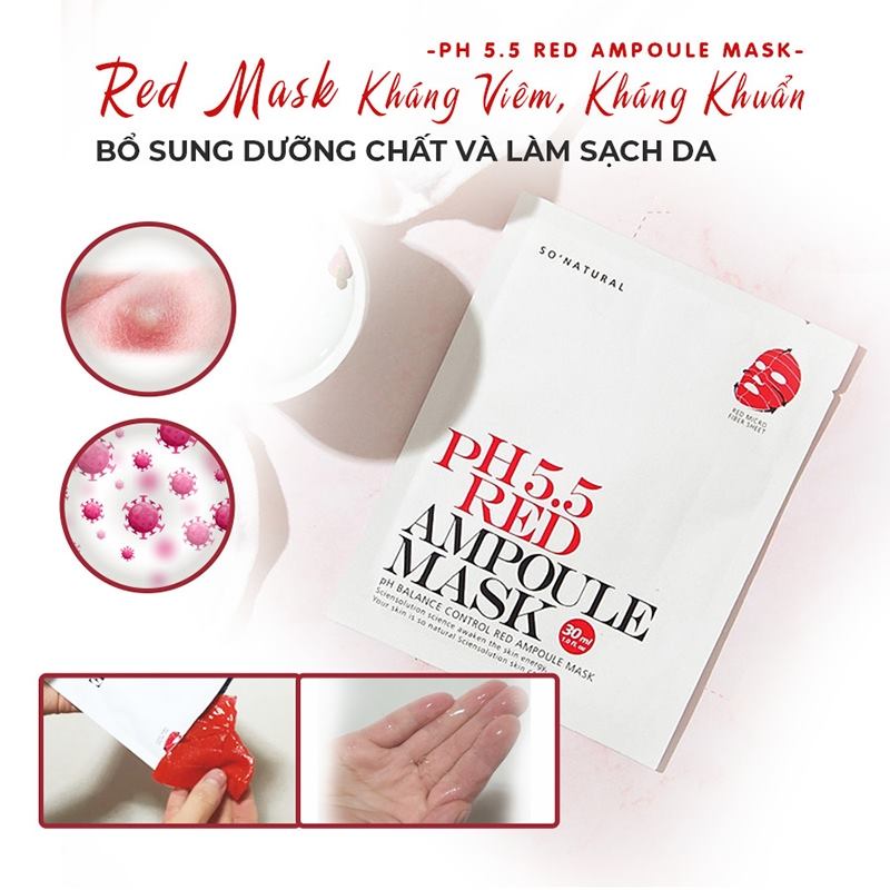 Song hành với các bước chăm sóc da thì việc đắp mặt nạ cũng là một bước quyết định góp phần vào việc cải thiện làn da. Vì vậy với chị em phụ nữ việc lựa chọn được một loại mặt nạ phù hợp với làn da của mình là hết sức quan trọng. Combo 5 chiếc mặt nạ So’Natural dưỡng ẩm cân bằng da pH 5.5 Red Ampoule Mask 25g là dòng sản phẩm phù hợp với hầu hết mọi loại da, từ da khô, da dầu, da mụn hay là da nhạy cảm, tất cả mọi đối tượng khách hàng đều có thể yên tâm sử dụng. Mặt nạ được sản xuất dựa trên các thành phần tự nhiên như tinh chất rau má và trà xanh kết hợp với AHA và BHA cùng với Niacin mang lại cho làn da cảm giác dịu nhẹ, căng bóng và thoáng mát khi sử dụng. Sản phẩm sẽ như một “ vị cứu tinh” cho chị em chúng ta trong mùa hè nắng nóng oi bức ngay khi vừa bỏ miếng mặt nạ xuống. Một cảm giác thông thoáng, sạch sẽ cùng với sự mềm mại sẽ là những điều bạn có thể dễ dàng nhận biết trong tức thì.