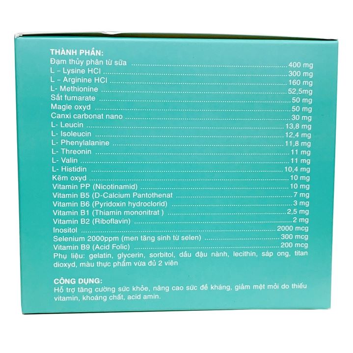 Thành phần: Đạm thủy phân từ sữa, L-Lysine HCl, L-Arginine HCl, L-Methionine, Sắt fumarate, Magie oxyd, Canxi carbonat nano, L-Leucin, L-Isoleucin, L-Phenylalanine, L-Threonin, L-Valin, L-Histidin, Kẽm oxyd, vitamin PP, vitamin B5, Vitamin B6, vitamin B1, vitamin B2, Inositol, Selenium 2000ppm, Vitamin B9