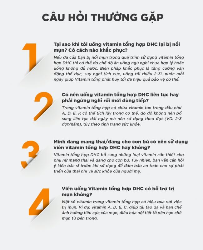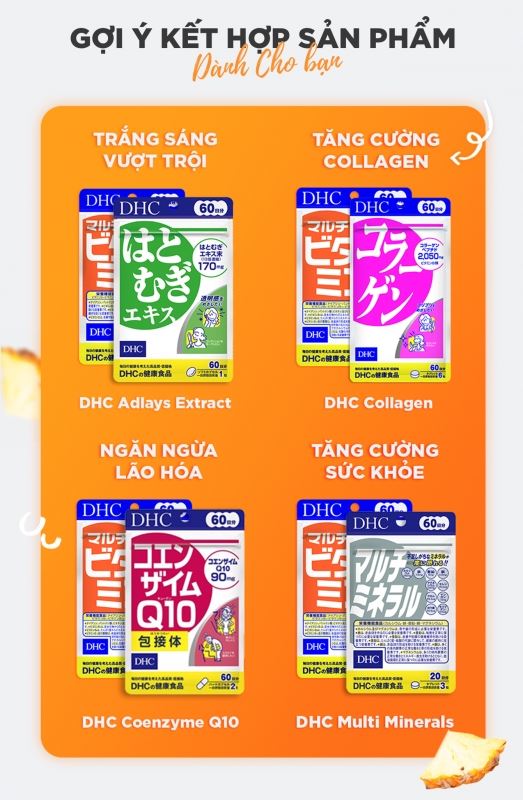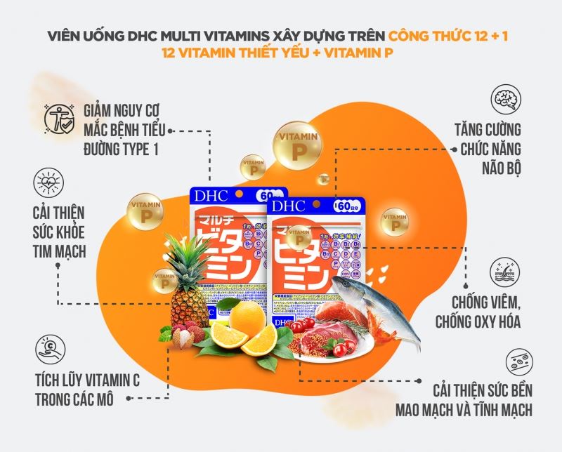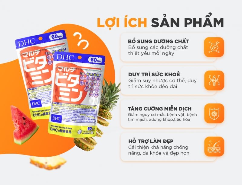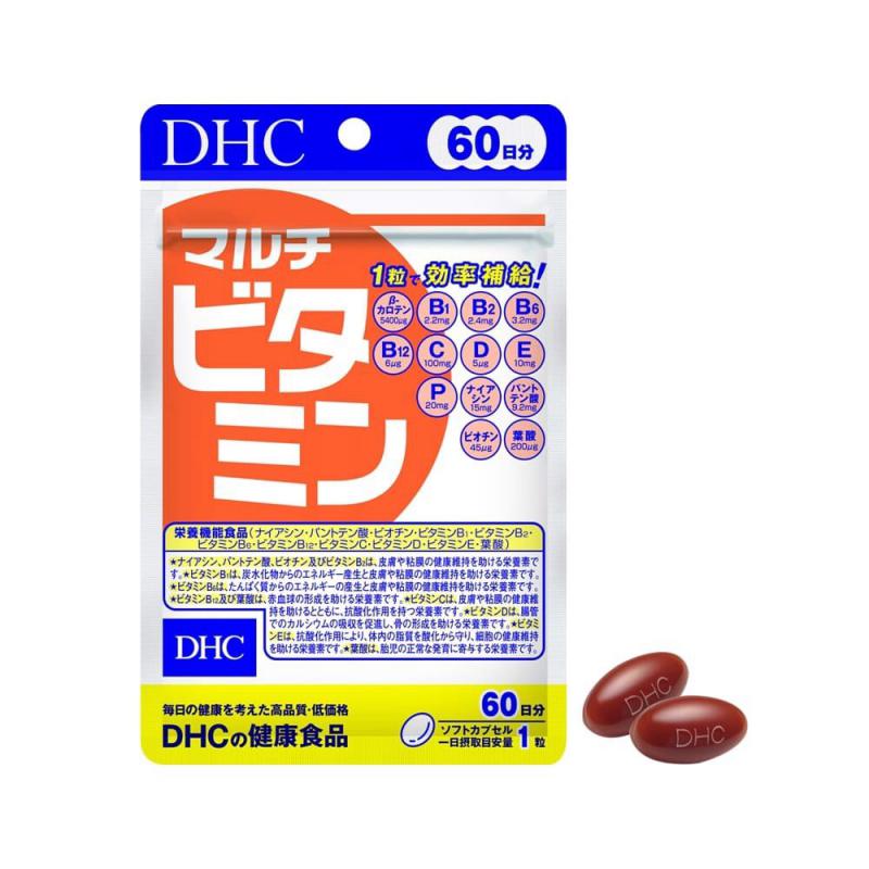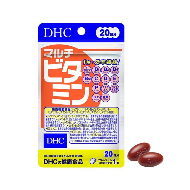Tên sản phẩmViên uống vitamin tổng hợp DHC Multi VitaminsThương hiệuDHCXuất xứNhật BảnCơ sở sản xuấtALIMENT INDUSTRY CO., LTD., Shinfuji Second FactoryThành phầnVitamin C (acid ascorbic), chiết xuất tảo dunaliella salina (tương đương beta caroten) , rutin biến đổi enzyme, niacin, vitamin E (d-α-tocopherol), vitamin P (hesperidin), calci pantothenat (tương đương acid pantothenic), vitamin B6 (pyridoxin hydroclorid), vitamin B2 (riboflavin), vitamin B1 (thiamin mononitrate), vitamin D3 (cholecalciferol), acid folic, biotin, vitamin B12 (cyanocobalamin), dầu oliu, lecithin, sáp ong, gelatin, glycerin vừa đủ 1 viên nang mềm.Công dụngBổ sung các vitamin cho cơ thể, giúp hỗ trợ bồi bổ sức khỏe.Hướng dẫn sử dụngNgười lớn: uống 1 viên/ngày (uống cùng nước ấm).Hạn sử dụng36 tháng kể từ ngày sản xuấtKhuyến cáoThực phẩm này không phải là thuốc, không có tác dụng thay thế thuốc chữa bệnh